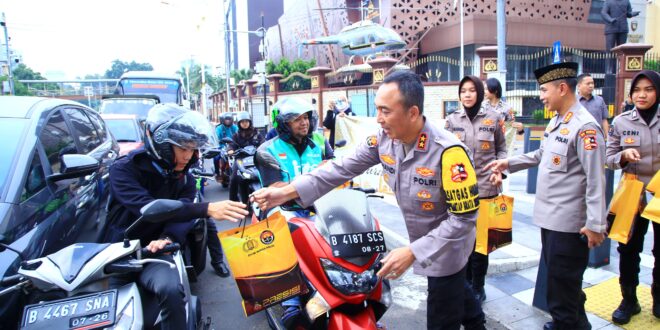 Divisi Humas Polri bersama wartawan melakukan aksi mulia dengan berbagi takjil berbuka puasa gratis kepada para pengendara. Kegiatan ini dilakukan di dekat lampu merah Markas Besar (Mabes) Polri pada hari ini, Kamis (28/3/2024).