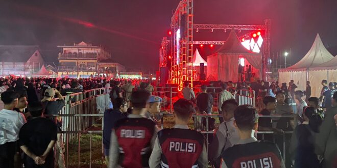 Kukar – Polres Kutai Kartanegara menyiagakan personel gabungan, untuk melakukan pengamanan konser Denny Caknan, di lapangan bola kecamatan Loa Kulu, Selasa (19/12/2023) malam.