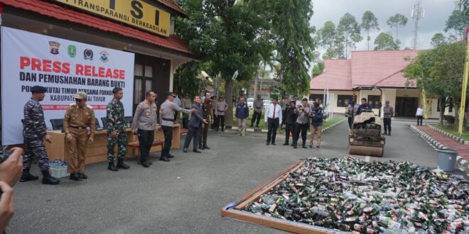 Kutim – Polres Kutai Timur (Kutim) dan jajaran memusnahkan barang bukti di Mapolres, Bukit Pelangi, Senin (17/4/2023) pagi. Barang bukti hasil operasi tersebut berupa 2008 botol minuman keras (miras) berbagai merek dan 8000 buah petasan/kembang api berbagai bentuk dan merek.