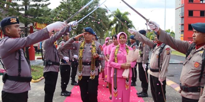 Samarinda – Haru, Tradisi Pelepasan dan Pedang Pora Komandan Batalyon B Pelopor AKBP Suwinto, S.H., S.I.K yang mendapat amanat baru sebagai Kapolres Pelalawan Polda Riau.