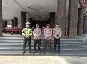 Kubar – Personel Polres Kutai Kutai Barat Polda Kaltim dan jajaran Polsek melaksanakan kegiatan pengamanan gereja-gereja di wilayah Kabupaten Kutai Barat, Minggu (7/5/2023) pagi.