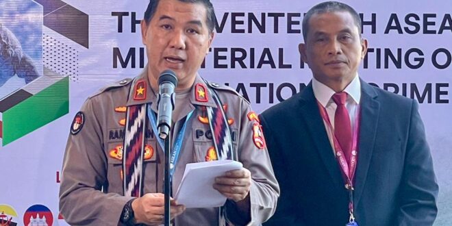 Karopenmas Divhumas Polri, Brigjen Pol. Ahmad Ramadhandi memberikan keterangan dalam press conference terkait pembukaan ASEAN Ministerial Meeting on Transnational Crime (AMMTC) ke-17 di Labuan Bajo, Nusa Tenggara Timur (NTT), Senin (21/8/2023). Pertemuan setingkat menteri ini diadakan dalam rangka menanggulangi kejahatan transnasional di kawasan ASEAN.