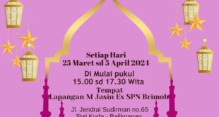 Balikpapan – Bhayangkari Polda Kaltim akan menggelar bazar murah dalam rangka menyambut bulan suci Ramadan yang akan digelar Senin 25 Maret sampai dengan Jumat 5 April 2024, pukul 15.00 sd 17.30 Wita bertempat di Lapangan M Jasin Ex SPN Brimob JI. Jendral Sudirman no.65 Stal Kuda Balikpapan. Kamis (21/03/24). Bazar …