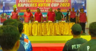 Kutim – Dalam rangka menyambut Hari Bhayangkara ke-77 tahun 2023 , Polres Kutai Timur menggelar Lomba Bulutangkis di Gedung Olahraga (GOR) Swarga Bara PT.KPC, Ds.Swarga Bara,Kecamatan Sangata Utara,Kab Kutim, dari tanggal 17 s/d 18 Juni 2023. Turut hadir dalam upacara pembukaan pertandingan Bulutangkis Kapolres Kutim Cup yakni Wakapolres Kutim Kompol …