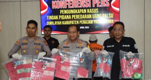PPU – Dalam konferensi pers yang dipimpin oleh Kapolres PPU, AKBP Supriyanto SIK M.Si, di Dampingi oleh Kapolsek Babulu Iptu Syaifudin SH dan Kasihumas Polres ppu mengumumkan keberhasilan dalam mengungkap kasus peredaran uang palsu yang terjadi di Labangka, Kabupaten PPU. Dua tersangka utama dengan inisial HR dan NR berhasil diamankan …