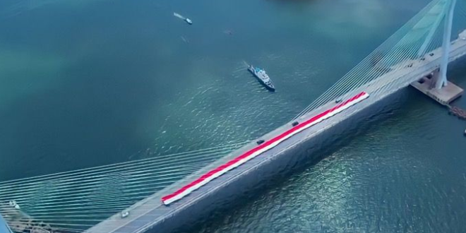 PPU – Polri turut menyemarakkan perayaan hari kemerdekaan ke-78 RI. Polri membentangkan bendera Merah Putih raksasa di sejumlah wilayah di Indonesia, salah satunya di Jembatan Pulau Balang, Kalimantan Timur. Jumat, 18 Agu 2023.