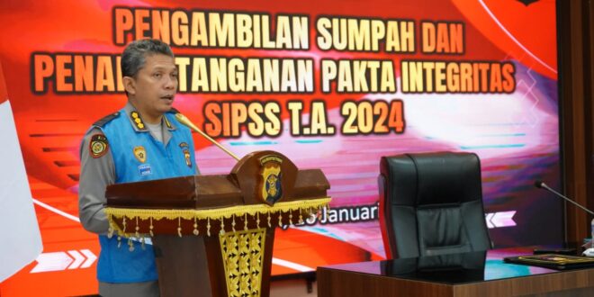 Balikpapan – Karo SDM Polda Kaltim Kombes Pol. Ari wibowo, S.I.K., M.H., pimpin pengambilan sumpah dan penandatanganan Pakta Integritas seleksi Sekolah Inspektur Polisi Sumber Sarjana (SIPSS) T.A. 2024, Selasa (16/1/2024).