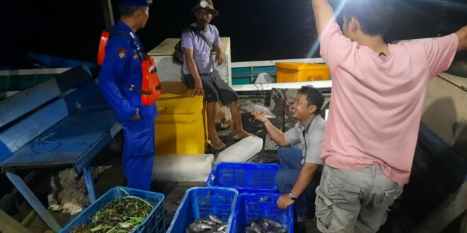 Kukar – Personel Satpolairud Polres Kutai Kartanegara melaksanakan patroli dan menyambangi nelayan di kawasan pesisir desa Sungai Meriam, Kecamatan Anggana, Rabu (29/8/2023) malam.