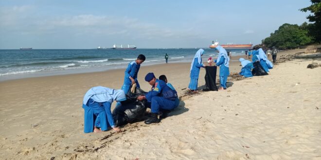 Dalam aksi bersih pantai tersebut personil Dit Polairud Polda Kaltim bergotong-royong bersama 26 siswa-siswi SMP IT Insan Mulia Balikpapan membersihkan sampah yang tersebar di sepanjang pesisir pantai Banua Patra.