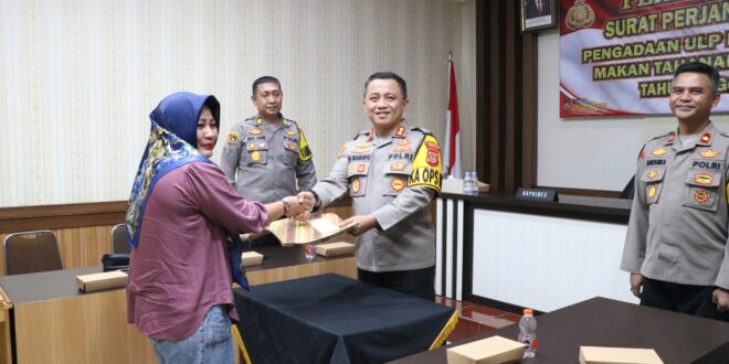 Berau – Polres Berau /menandatangani surat perjanjian kontrak pengadaan Unit Layanan Pengadaan (ULP) Non Organik dan makanan tahanan untuk tahun anggaran 2024. Penandatanganan dilakukan / di ruang rapat Polres Berau, yang dihadiri oleh Kapolres Berau, AKBP Steyven Jonly Manopo, serta pihak-pihak terkait dalam pelaksanaan program ini.