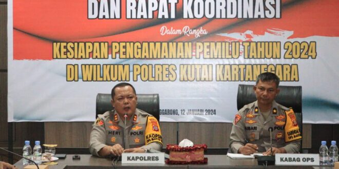 Kukar – Kapolres Kutai Kartanegara AKBP Heri Rusyaman pimpin langsung pelaksanaan gelar operasional (GO) dan rapat koordinasi (Rakor) dalam rangka kesiapan pengamanan pemilu 2024 Jum’at (12/1).