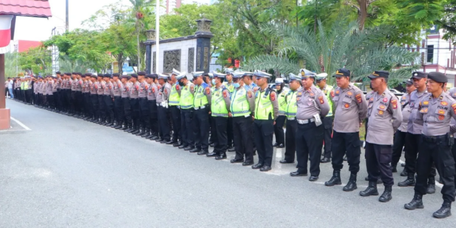 Balikpapan – Polda Kaltim menggelar apel gabungan kesiapan pelaksanaan tugas pengamanan ibadah malam Natal yang dilaksanakan di halaman Polresta Balikpapan, Minggu (24/12/2023).