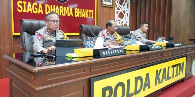 Balikpapan – Satgas OMB Polda Kaltim yang dihadiri oleh Kapolda Kaltim Irjen Pol Drs. Nanang Avianto, M.Si., Didampingi Wakapolda Kaltim Brigjen Pol Drs, Mujiyono, S.H., M.Hum, Irwasda Polda Kaltim, Karo Ops Polda Kaltim mengikuti Latihan Olah Strategi OMB 2023-2024 Secara virtual di Rupatama Polda Kaltim, Senin (6/11/23).