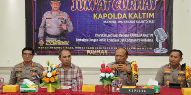 Balikpapan – Melalui Program yang bertajuk “Jumat Curhat”, Kapolda Kaltim Irjen Pol Drs. Nanang Avianto M.Si, turun langsung untuk mendengarkan berbagai aspirasi dari masyarakat yang bertempat di Aula Kantor Kec.Balikpapan Selatan, Jumat (22/12/23).