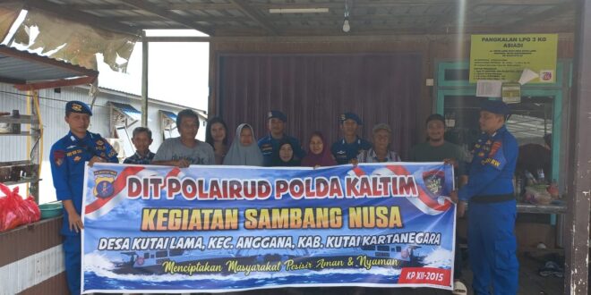 Kukar – Personil Kapal Patroli KP XII-2015 menggelar kegiatan “Sambang Nusa Presisi” Ditpolairud Polda Kaltim dengan menyambangi warga di Kampung Pesisir Desa Kutai Lama Kec.Anggana Kab.Kukar, Minggu (28/01/24).