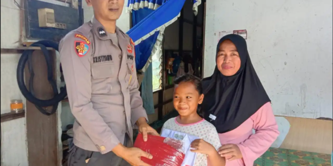 Sebagai bentuk kepedulian, Bhabinkamtibmas Polsek Kota Bangun Aipda Kristianto memberikan satu set seragam Sekolah Dasar kepada seorang anak di desa binaannya.