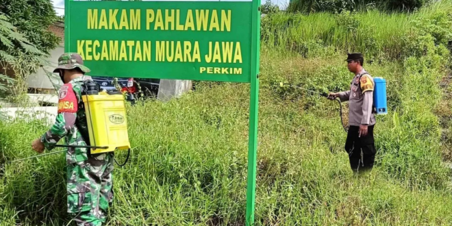 Kukar – Disamping memelihara situasi dan kondisi Kamtibmas diwilayah Binaan, Bhabinkamtibmas Kelurahan Muara Jawa tengah Aiptu Utoyo bersama Babinsa Serma Sarwani melakukan giat penyemprotan rumput di Tempat Makam Pahlawan Kecamatan Muara Jawa yang ada di Wilayah Binaan.