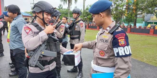 Samarinda – Personel Batalyon B Pelopor dan Subden Komposit Gegana Satuan Brimob Polda Kaltim melaksanakan kegiatan positif rutin yaitu gerakan infaq dua ribu yaitu kegiatan sedekah dengan menyisihkan sedikit rejeki setelah pelaksanaan apel pagi.